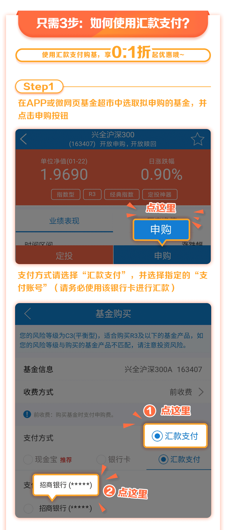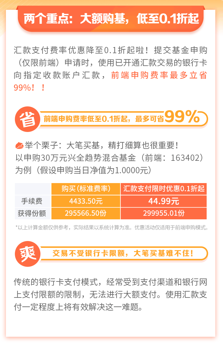 汇款支付,购基0.1折起哦!
